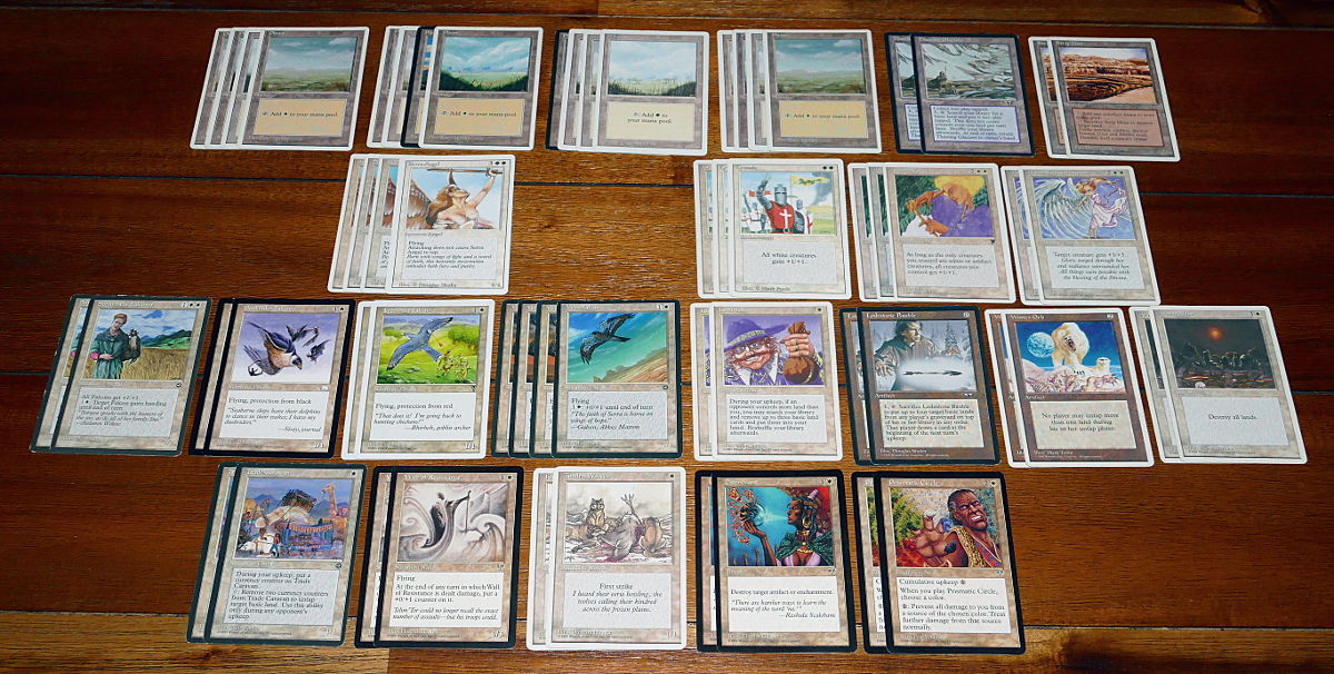 This all-white Falcon-themed horde deck depends on rapid deployment of small creatures to overwhelm the enemy early in the game, and takes advantage of the Falcons’ flying ability to avoid landbound blockers. It has a pretty deep ability to promote creatures (by type, by color, and individually), making it very competitive in the long game, which is uncharacteristic for a horde deck. The fact that it is a mono-color deck is strategically advantageous in that the deck cannot get hung up early over not having enough of one color of mana available (which can sometimes happen to The Rat Race). This deck also has a moderate ability to restrict access to mana, including removing all land in play, and includes measures to cope with this mana restriction. This makes it possible to severely limit opponents’ ability to field creatures, especially expensive large ones, should circumstances make that tactically desirable.