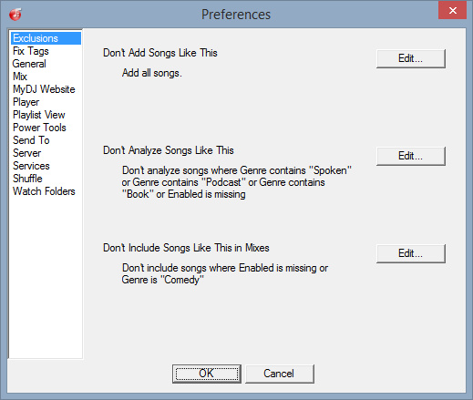 It’s helpful to set some exclusions if you have .mp3s that you don’t want in a playlist: maybe non-musical stuff like podcasts and comedy albums, or short interlude tracks that make sense in the context of an album, but not so much for a playlist. You can set exclusions on the Exclusions tab of the Options dialog box. This is a straightforward rule-based process. There is also a way to enable/disable individual tracks (by right-clicking on them in the Library window and turning Enabled off), which provides an easy way to disallow specific tracks.