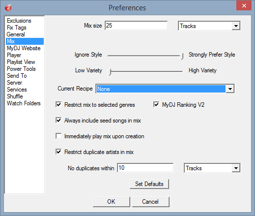 Recipes allow you to add to the constraints used by the selection algorithm, or modify the existing constraints, or create conditions that would make some tracks more likely to be selected, by a little or a lot. There are a few default recipes, which you can opt to use in the Mix tab of the Options dialog box, or you can add your own. Programatically, this is really powerful stuff.