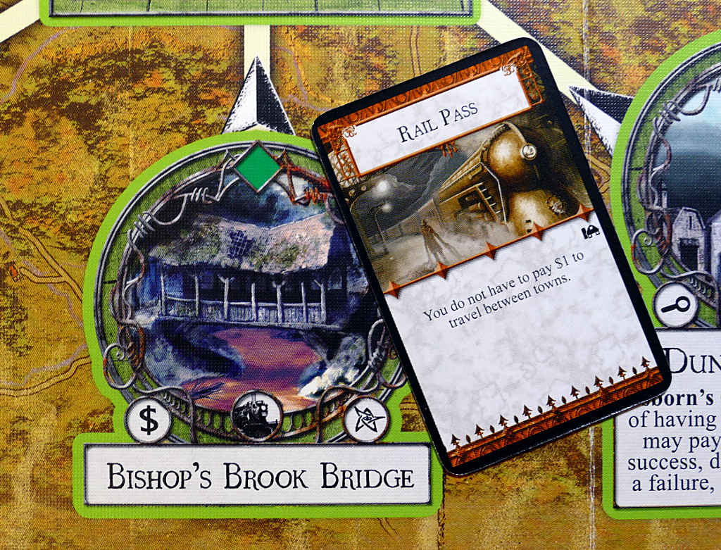 It is possible to obtain a Rail Pass during a Location Encounter at the Train Station or Bishop’s Brook Bridge; an Investigator possessing a Rail Pass does not have to pay the $1 fee to travel between boards. The odds of the appropriate encounter happening are 1:6 at each Location; at the Train Station you are offered the opportunity to buy a Rail Pass for $3; at Bishop’s Brook Bridge you find a discarded Rail Pass if you pass a Luck check [-2].