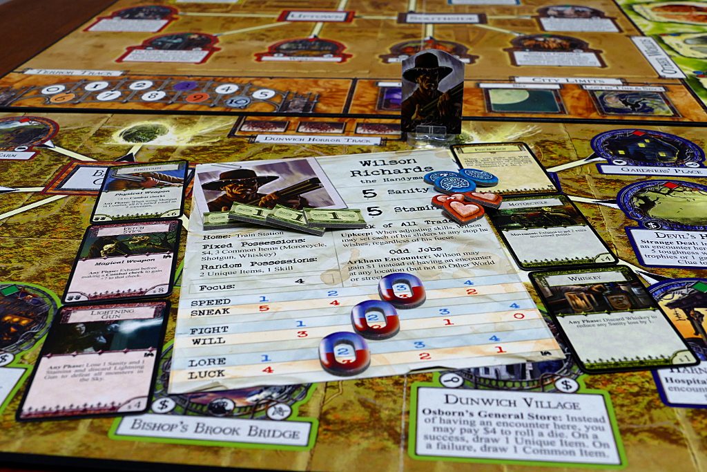 Four of the Dunwich Locations have Special Encounters; they variously allow Investigators to: trade Trophies for both Money and Clues; pay $4 for a random Item (2:1 chance of Common vs. Unique); gamble at even odds; and regain a point of Stamina or Sanity for free.
