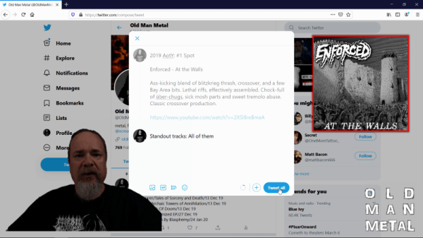 New year, new studio! Old Man Metal charts the Top Ten Metal Albums of the Year for 2019 in a New Year's Day Twitter countdown on the sixth episode of his solo podcast. Great new crossover, thrash, death metal, black/speed, black/thrash and death/thrash from Enforced, Wraith, Usurper, Legion of the Damned and more... including his riches-to-rags search for a new studio courtesy of recently-added green screen and chromakey capability.